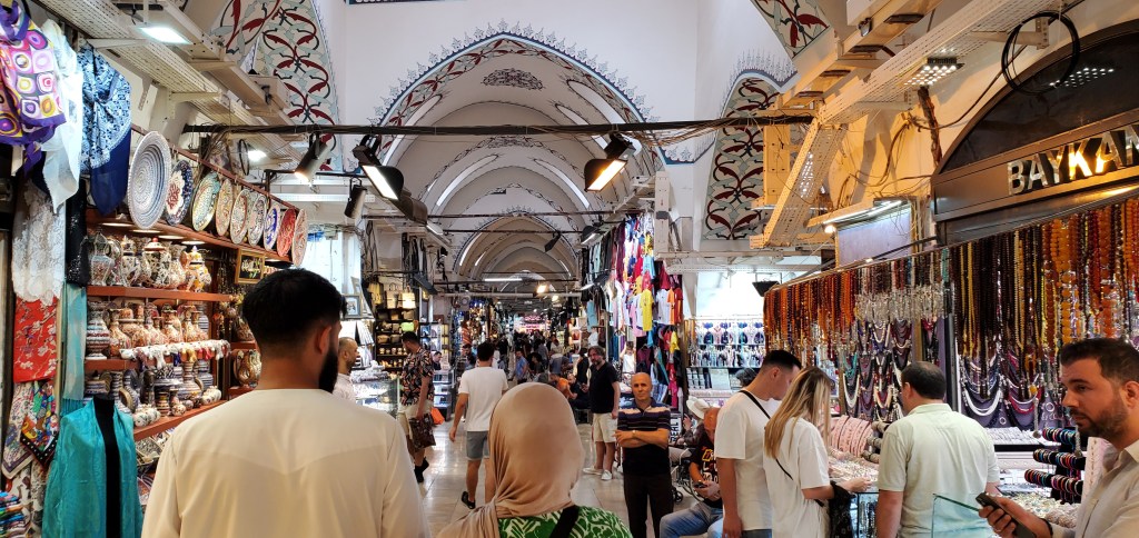 In addition, I also got to explore the Blue Mosque across the way which was really neat to see. The mosque has a total of 6 minarets, and it was also incredible to see. Nearby both mosques is the Basilica Cistern which was built back during the days of the Byzantine Empire which once stored over 75 million liters of water. The cistern is very dark inside, but dim lights allow you to navigate inside, and the lights change colors every few minutes. After exploring the cistern, I then went over to the Grand Bazaar which has so many different vendors trying to sell you everything from carpets to other goods. Navigating the bazaar can be rather challenging and maze-like, but it is very intriguing and makes you excited to see something new at every corner.